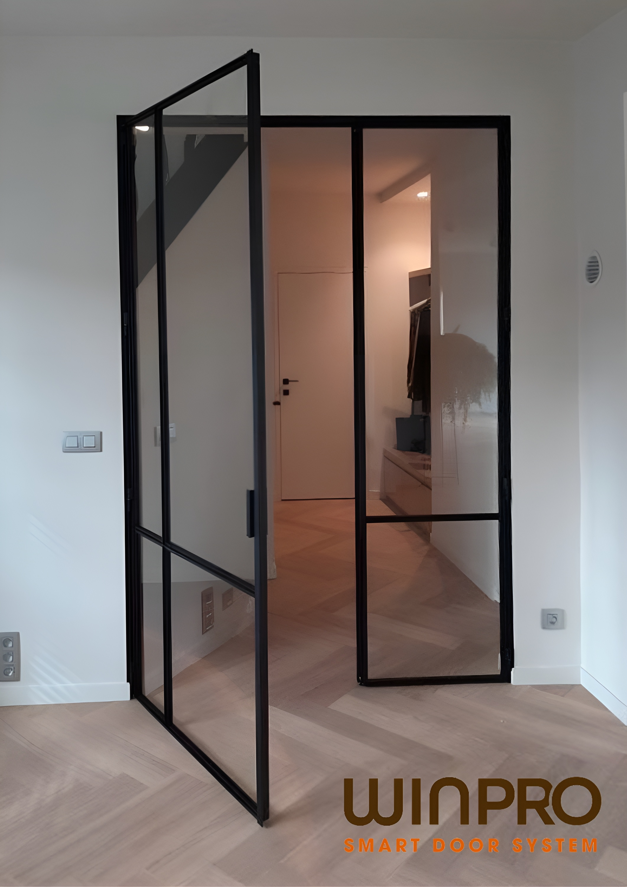 Cửa nhôm mỏng mở quay có khả năng hoạt động mà không để lộ bất kỳ bản lề nào bên ngoài, tạo ra sự hài hòa trong thiết kế.